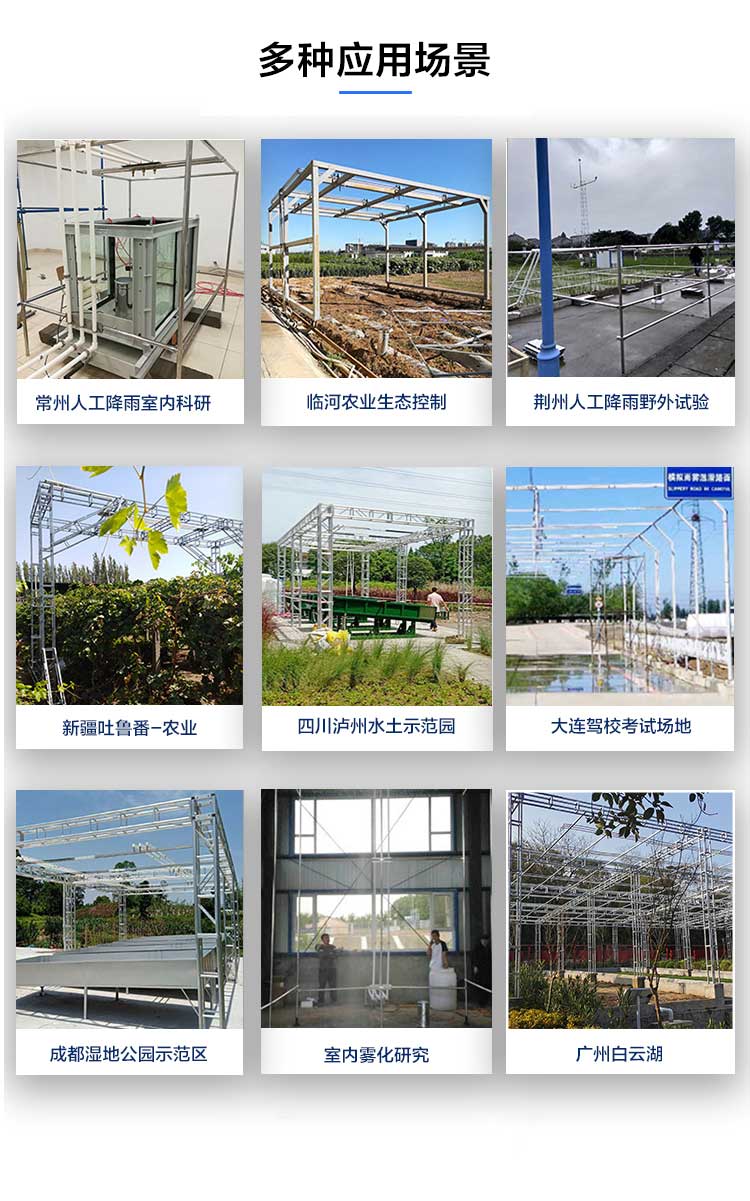 野外人工模拟降雨系统能够精确模拟不同强度、频率和持续时间的降雨,为研究人员提供一个可控制、可重复的降雨环境。野外人工模拟降雨系统是一款集高精度、多功能于一体的先进设备。它专为环境研究、农业试验、城市规划和景观设计等多个领域定制,能够精确模拟不同强度、频率和持续时间的降雨,为用户提供一个高度可控制、可重复的降雨环境。